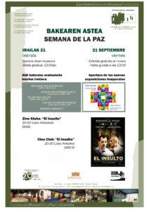 - Cinema: El insulto (Dir. Ziad Doueiri, 2017) in collaboration with Gernika Zine Klub Group and the Cultur House, at 20:30 in Lizeo Cinema; free entry.