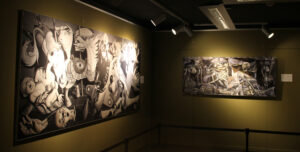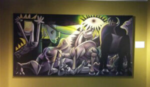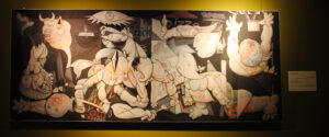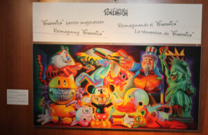 He hecho mi propia interpretación del “Guernica” en más de 100 ocasiones. Puedo usar personajes distintos y reflejar la composición más o menos fielmente en las diferentes versiones, pero siempre improviso sobre el mismo mensaje básico — que nuestra narrativa incorpora las tendencias culturales. Mis Guernicas llaman la atención sobre el lugar que ocupa el producto de la cultura corporativa mundial, que utiliza la guerra como entretenimiento y el entretenimiento como guerra.