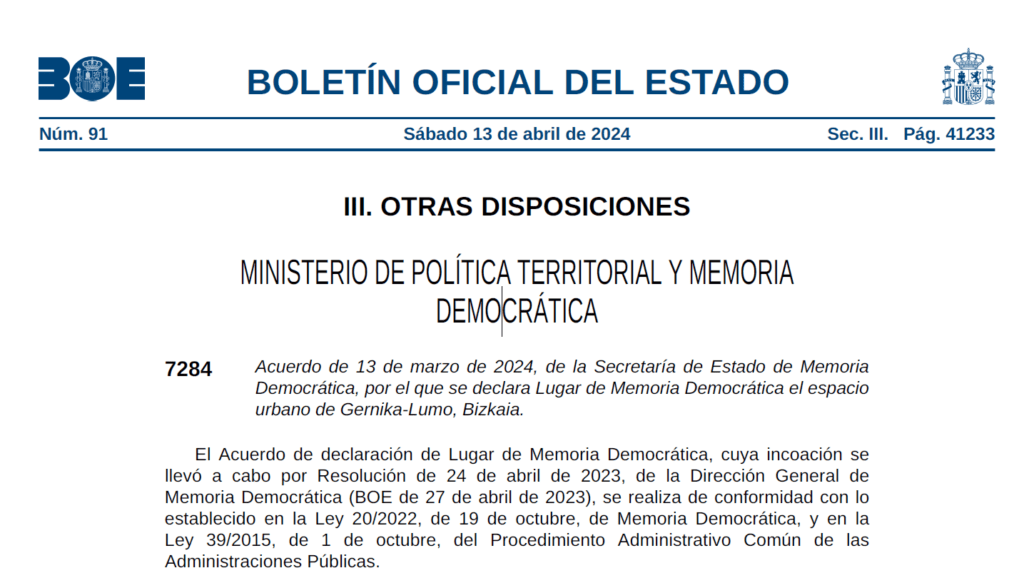 Conformément à l’accord du 13 mars 2024 du Secrétaire d’Etat à la Mémoire Démocratique, l’espace urbain de Gernika-Lumo, Bizkaia, est déclaré Lieu de Mémoire Démocratique.